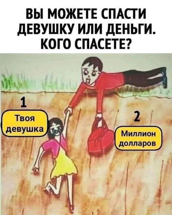 Михаил Ясинов Тут надо еще добавить, что без денег может и не быть девушки. Как известно, в человеческой культуре деньги решают любую проблему и смывают любую грязь. Жаль конечно девушку, придется пожертвовать ею и спасать деньги. А они на дороге не валяются. Не взял их? Обязательно их возьмет кто то другой. Не можешь духом убеждать людей? Покупай их! У каждой вещи и у каждого человека всегда есть своя цена.