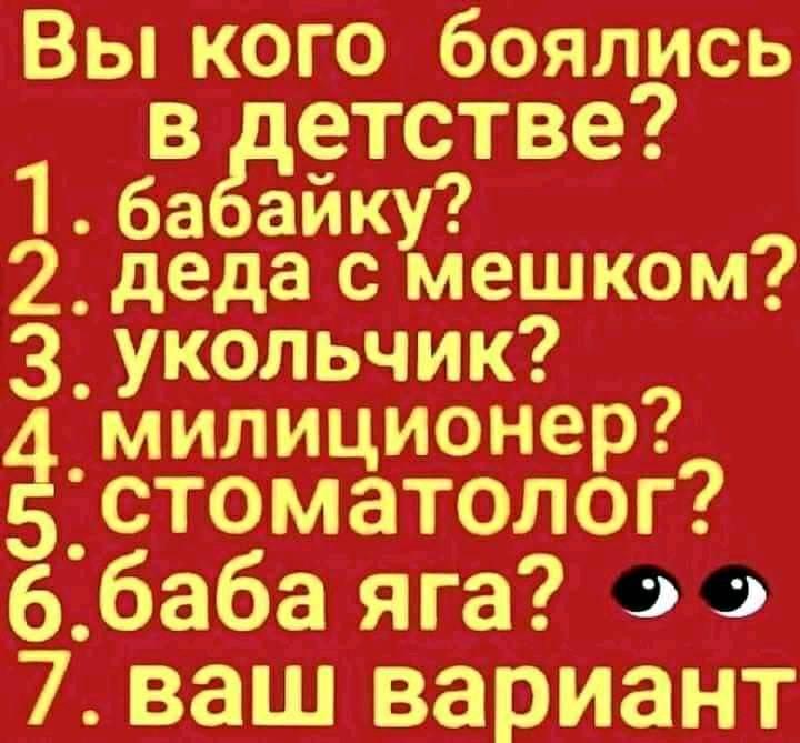 А родители ни когда меня ни кем не запугивали,им было не до меня,работали с утра до ночи ,а мы с братом ,как вольные птицы были...с 6 лет уже картошку жарила😂😂😂