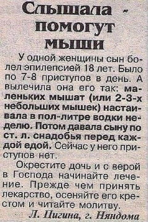 У моего одноклассника была эпилепсия, его мать сама врач - кардиолог. Врачи помочь ему не могли. Мать(член КПСС, 1970 - е г.г.), натихаря возила его по бабулькам - знахаркам, и таки они помогли, отшептали заговорами и молитвами. После школы, с таким диагнозом, его нигде не брали на учёбу ни токарем, ни пекарем. Парень выучился на закройщика женской одежды, шьёт на заказ эксклюзивные вещи, очередь на пол года вперёд. Параллельно держит сеть магазинов брендовой одежды. Болезнь больше не давала о себе знать. Вот так бывает...